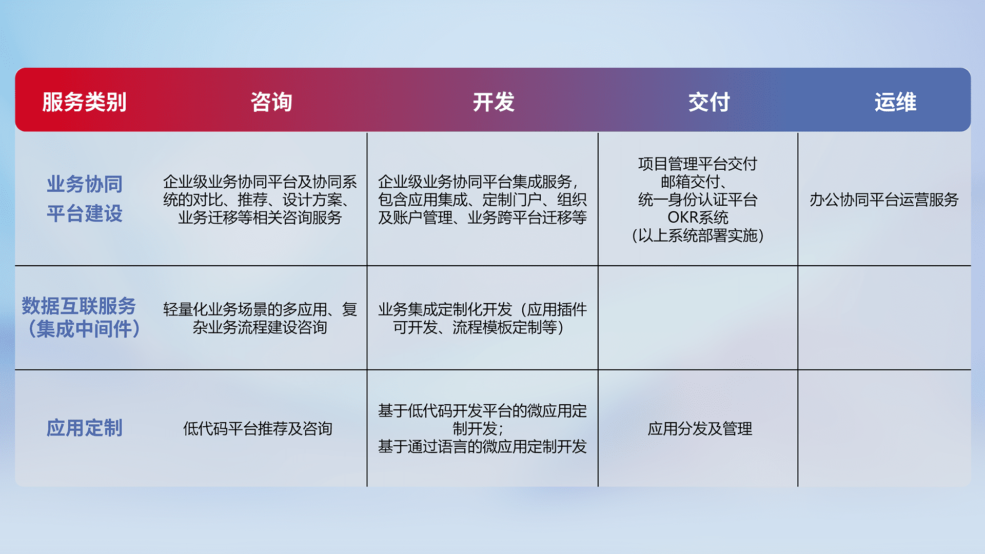针对钉钉、、、企微、、、IDaas等平台级产品提供产品的规划、、方案、、、、交付、、、定制化开发等服务,,,,实现如统一协同办公、、、、智能客户服务、、、、混合会议管理、、、智能数据查询、、等业务场景,,,实现数字化转型。。。。